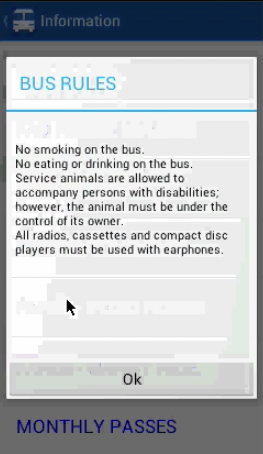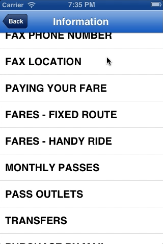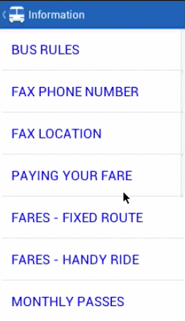 In September, we decided to put the Sonar / Nearby Stops feature on hold once we realized that supporting this feature would not be cost-effective if we were going to make this application a free app with advertising. So, in its place, we decided to replace it with the Information feature that we were planning on adding to the app based on the results of the aforementioned Associated Student Government (ASG) survey.