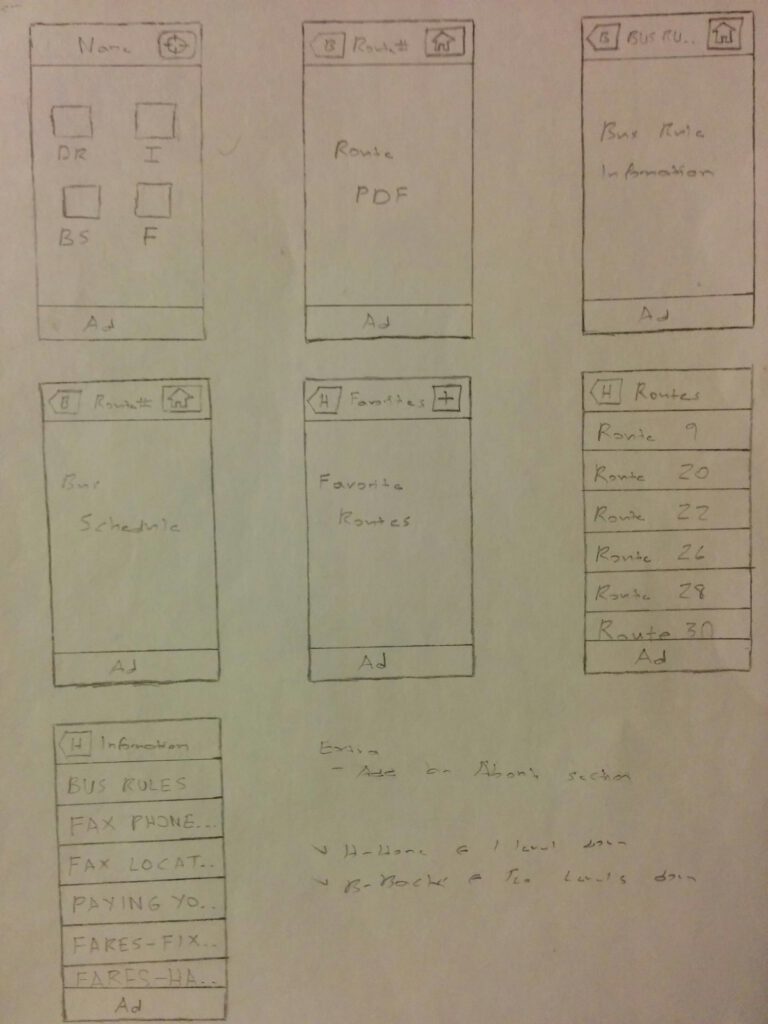 The key element is that a custom home button would be placed on the right hand side of the navigation bar if the user was two screens down whilst using the application. This applied to the following features: Display Routes, Information, and the Bus Schedule. Here are my wireframes, which I used to create a POP prototype: