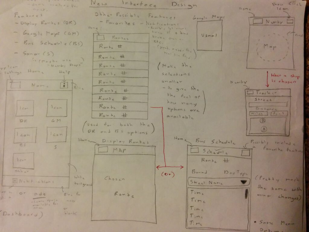 One of the first features that was added after the class ended was a sonar feature. As the name implies, this feature would allow users to be able to find bus stops within a certain radius from their current location.The user would be able to pick a stop and then hone in on the stop as they walked towards it. The sonar feature would then tell in intervals how many feet/miles they were away from a particular stop. This feature was also known as the Nearby Stops feature.