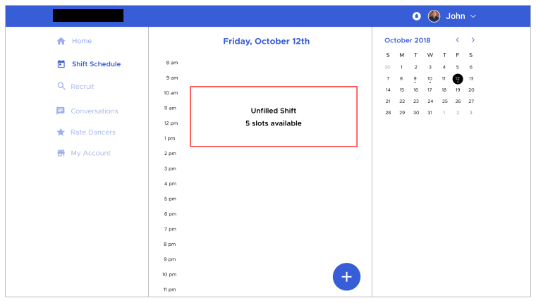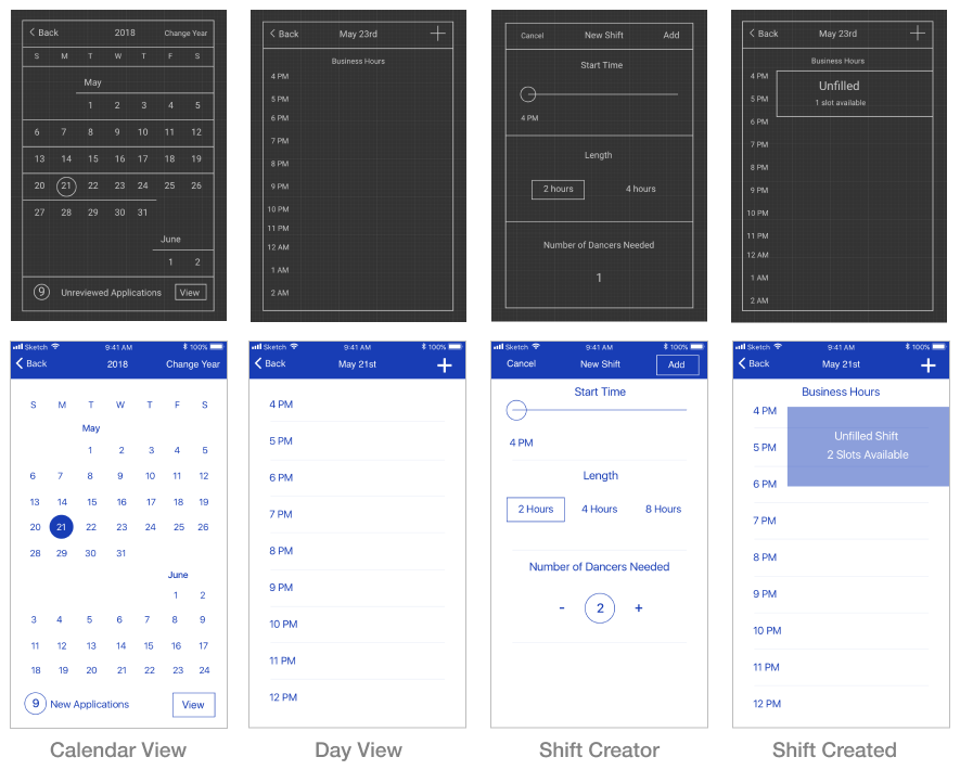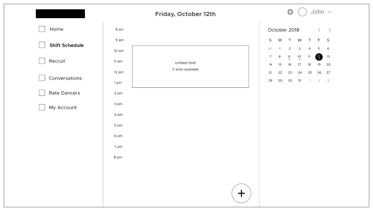 The last major feature and flow that I would design before temporarily leaving would be the business perspective (club owner)’s shift schedule feature and its associated shift creation flow (wireframes are shown to the right in black and white).