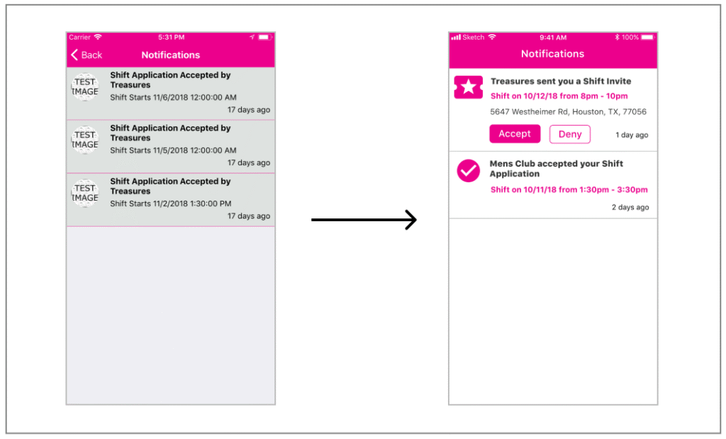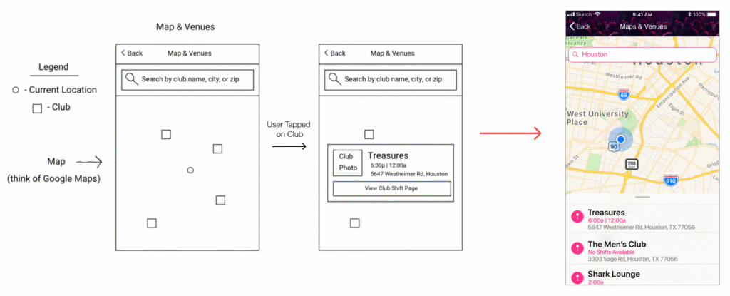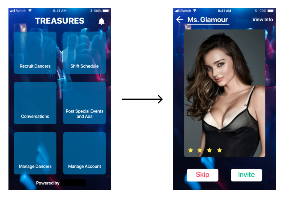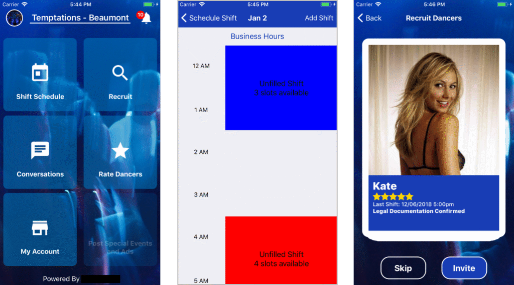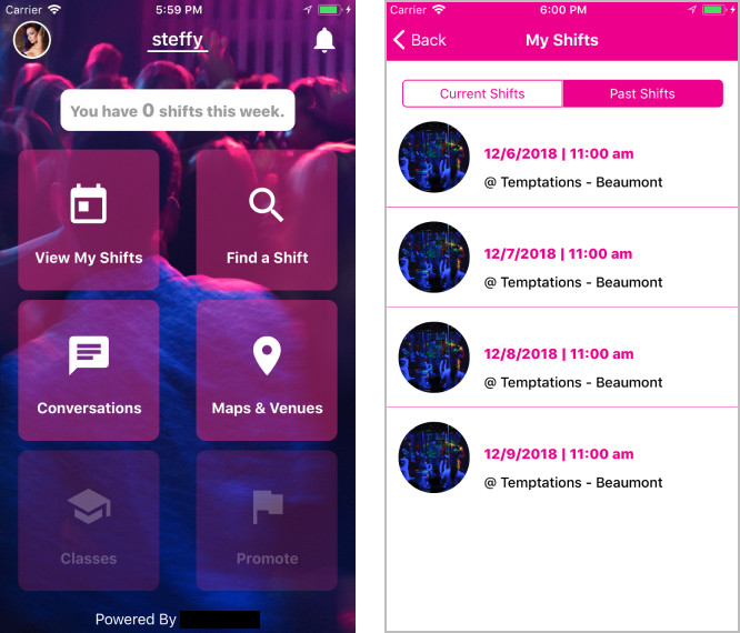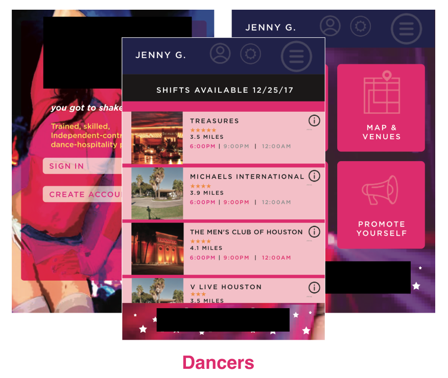 After doing an initial exploration on how the app could be used by contractors in the Information Technology industry, I was given the specs and some initial mockups for how the app would cater to the exotic dancing space. There would be a worker and business perspective. In this case, the workers were the dancers and the businesses were the club owners / managers.