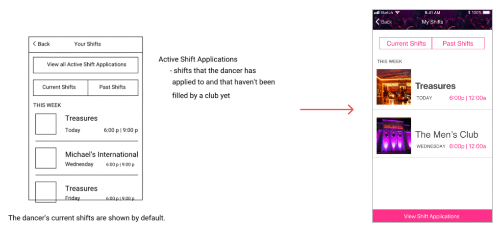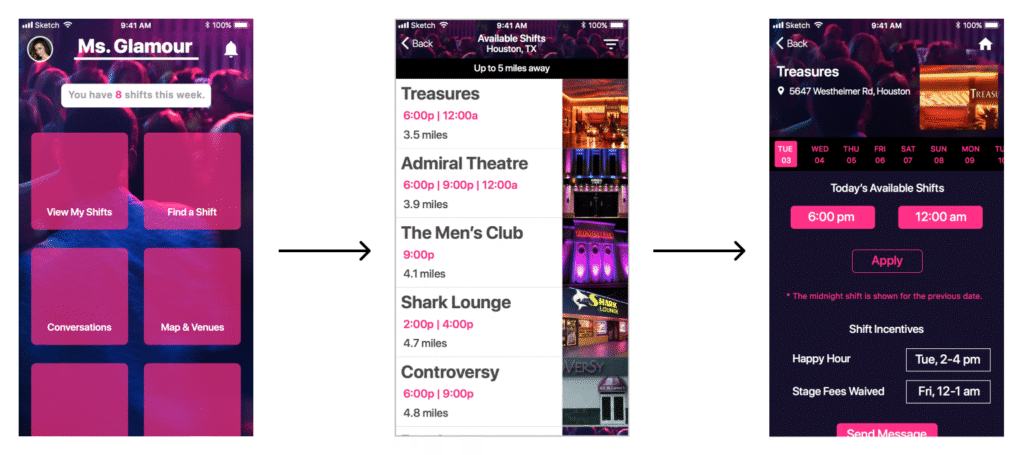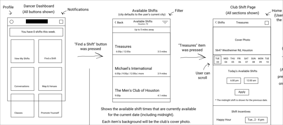 Below, you will see a preview of one of the major flows. This is the main way in which dancers would be able to find and apply for shifts.