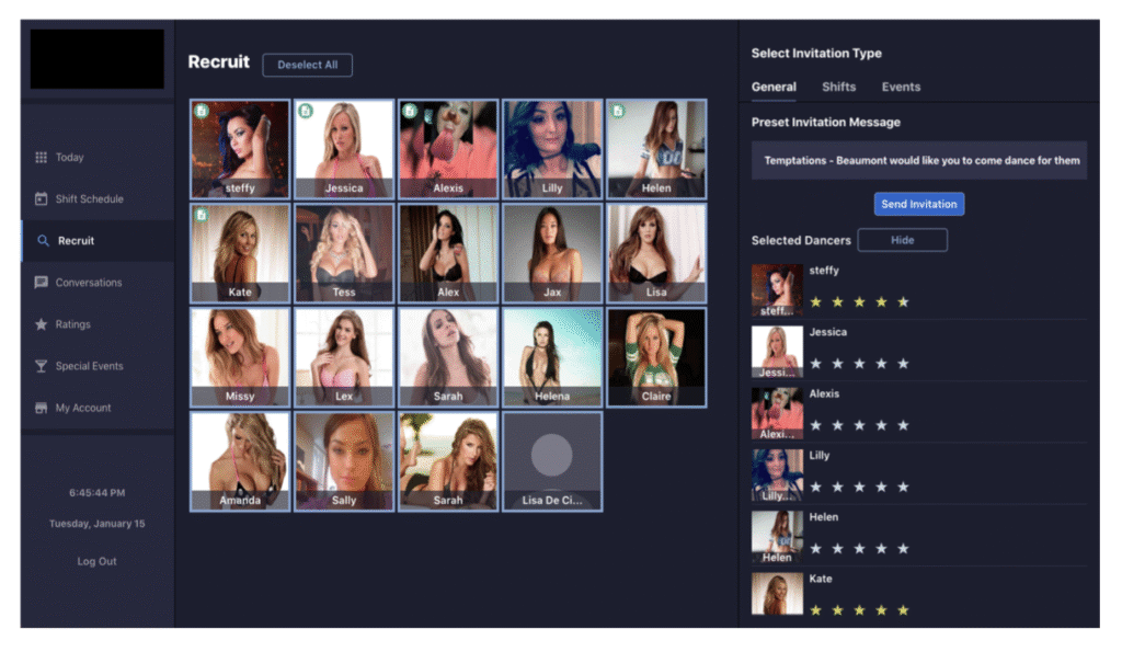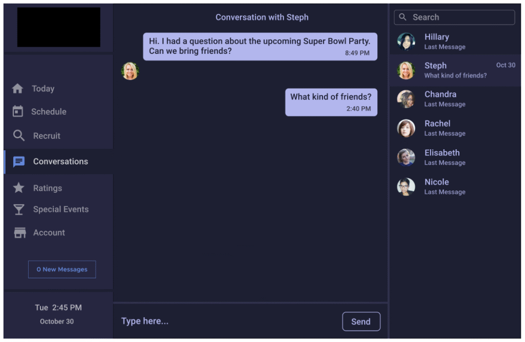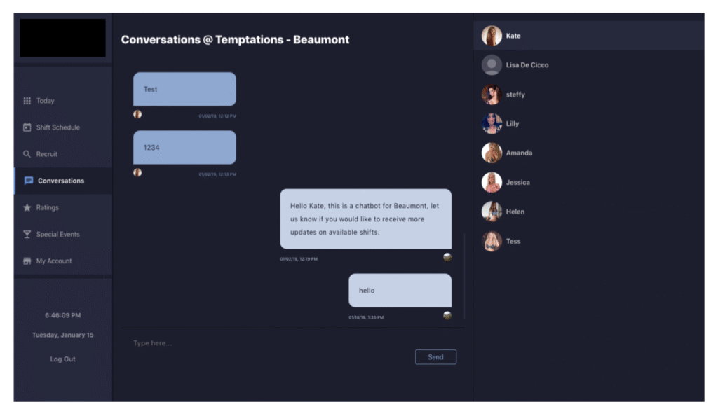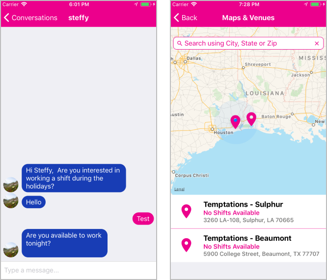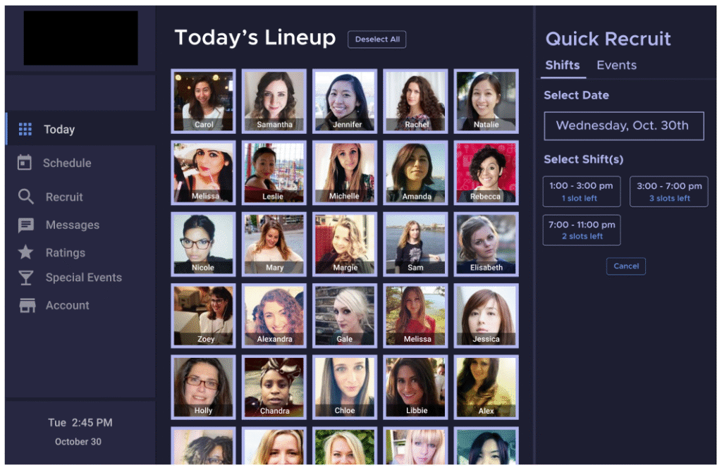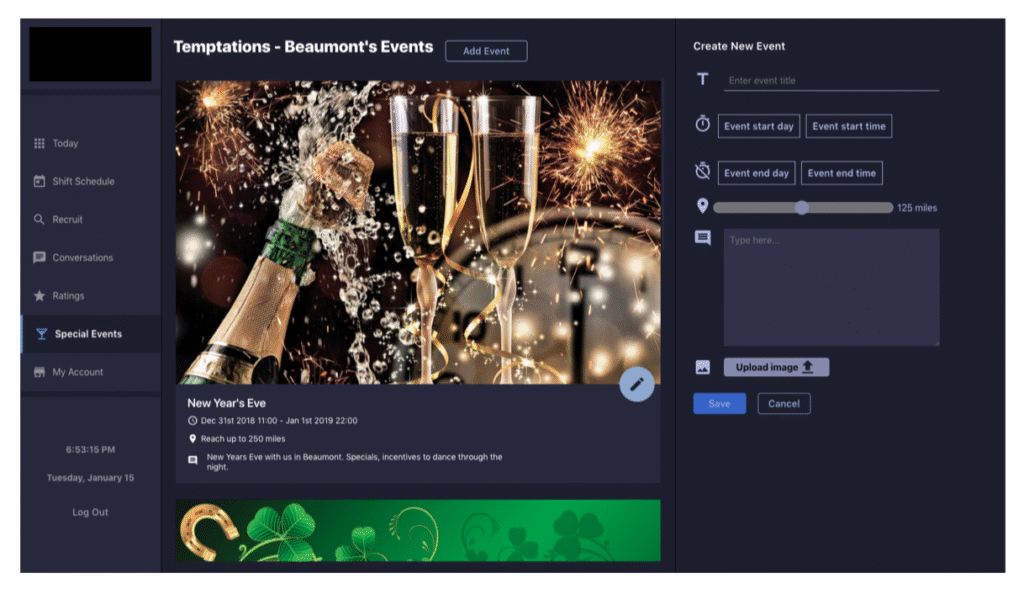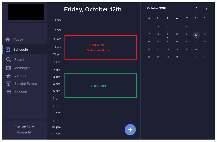 For businesses, they are given the ability to recruit workers, create and schedule general and event-specific shifts, converse with workers, and rate completed shifts.