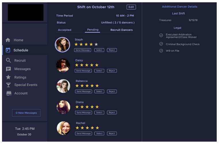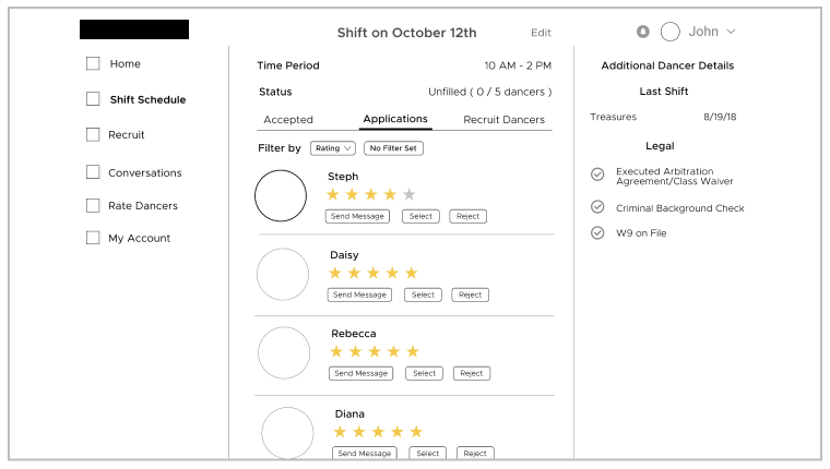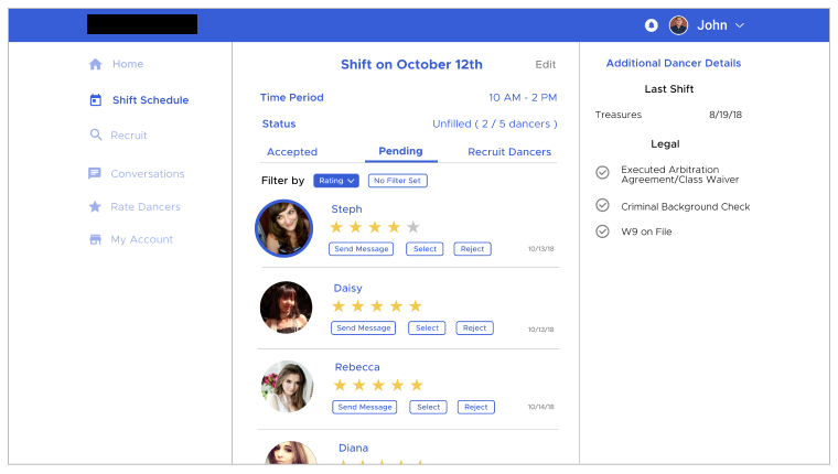 After a number of wireframes had been created and confirmed by the product manager and client, the product manager prioritized the need to move some features to the high-fidelity and development stage. I suggested the dashboards for the two user segments, the main flow for how a dancer would apply for a shift, and the recruit dancers screen.
