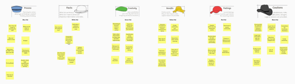 At the end of the meeting, Dorothy and I co-led a 6 thinking hats activity. During this activity, we had the client and her teammate think about this endeavor from different perspectives. Here’s a full picture of the results and a snapshot that you can read: