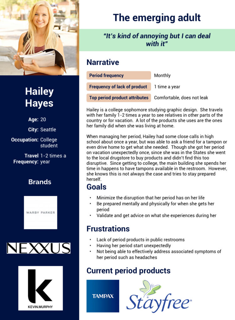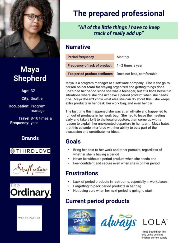 Based on some early data, I suggested that we could split up the personas based on who was prepared for the unexpected situation of being on your period when you least expected it. However, when comparing the data from all of our sessions, we could see that everyone had their period management routine down to an extent. Besides that, we could see that were two characteristics that was represented heavily: professionals and travelers. So, it made sense to create two personas that were representative of these characteristics.