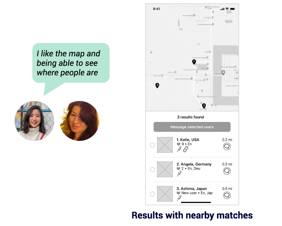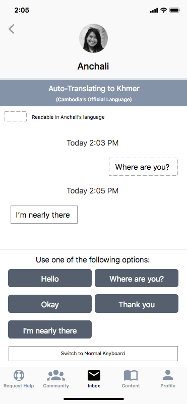In the end, the client chose to move forward with the Beacon concept. She wanted to support both the domestic and international angles. For the international angle, she also wanted there to be some type of translation capability so that users that spoke different languages would be able to communicate with one another.