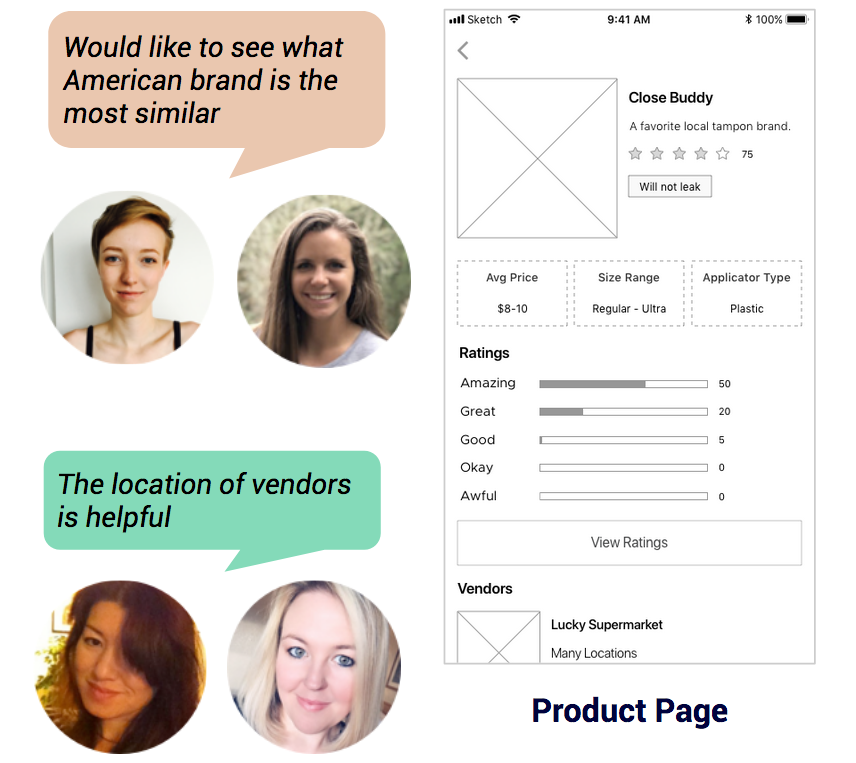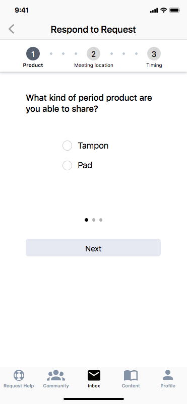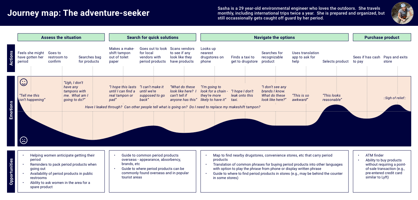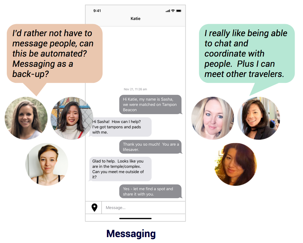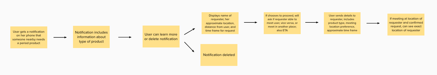 My teammate and I worked through a user-centered design process over the course of 4 weeks (3 sprints) that ultimately resulted in a volunteer-oriented mobile solution that helps women travelers obtain period products when they unexpectedly find themselves on their period without tampons / pads on them.