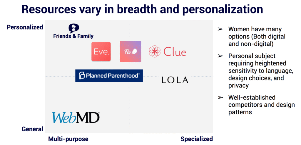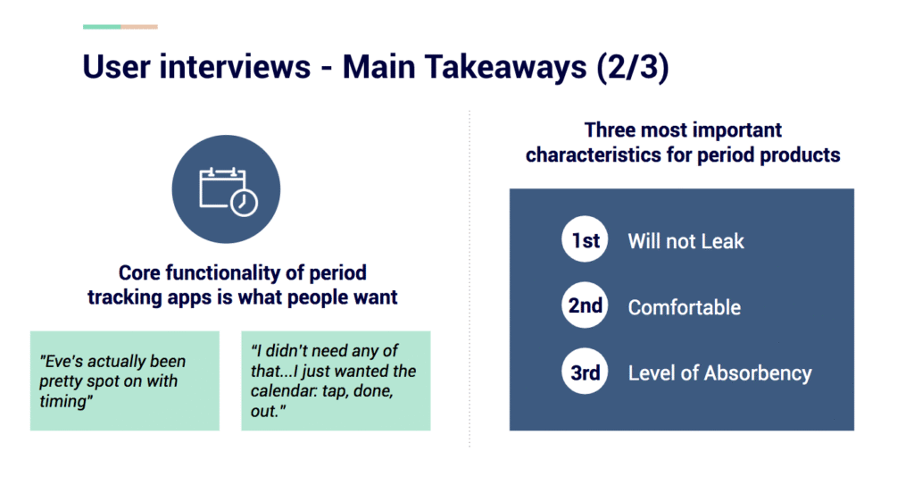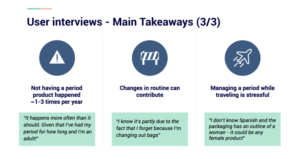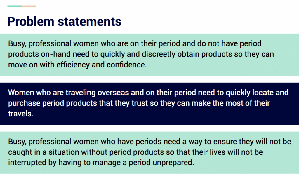 “Understand the resources (information and product) users currently use to manage their menstrual health and challenges they have encountered, especially when traveling.”