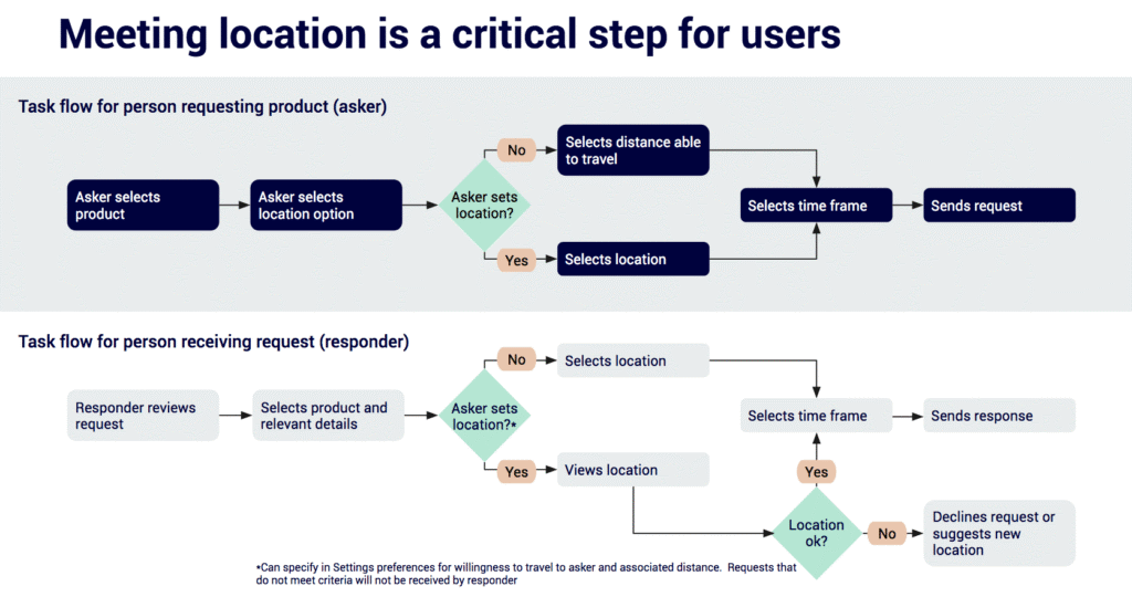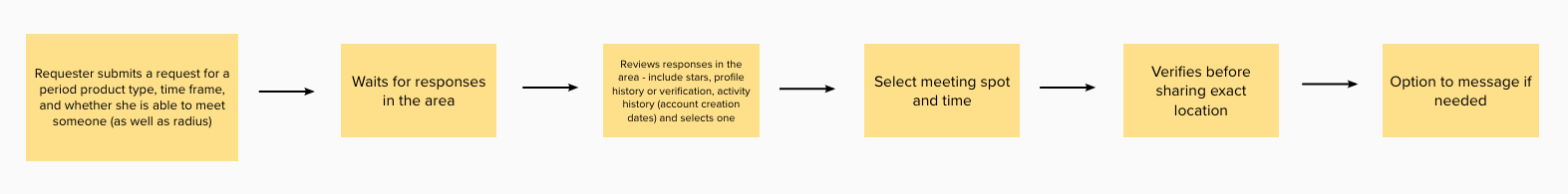 Choose period product ⇒ See search process (distance slowly increases) ⇒ See nearby app users who could help ⇒ Select one or more users ⇒ Select a meeting location from a list of recommended locations (as a suggestion) ⇒ Select a time frame (as a suggestion) ⇒ Send request