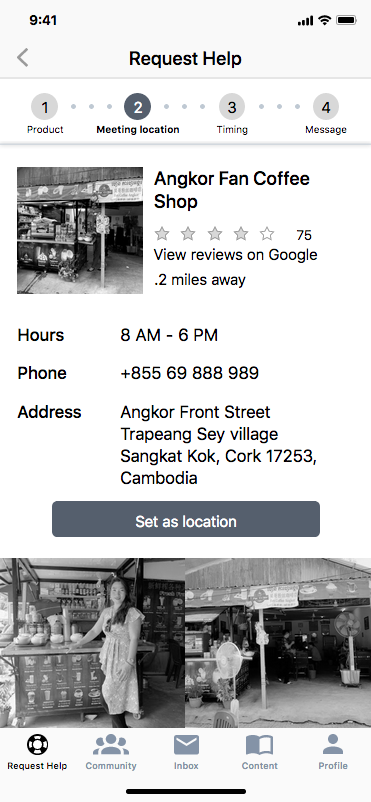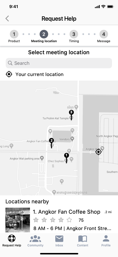 While creating these wireframes, it became apparent that the step where the user chooses the meeting location was a crucial part of the process. So, the request and request received flows revolved around this choice.
